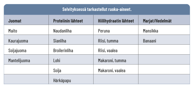 Selvityksessä tarkasteltiin 16 eri ruoka-ainetta neljästä eri ryhmästä. Ravitsemuksellisena mittarina käytettiin ravintoainetiheyttä, joka kuvaa suojaravintoaineiden määrää tuotteessa. Suojaravintoaineita ovat ne ravintoaineet, joita ihminen tarvitsee ja joita elimistö ei osaa valmistaa itse: ne pitää saada ruuasta. Niitä ovat vitamiinit, kivennäisaineet sekä välttämättömät rasvahapot ja välttämättömät aminohapot.