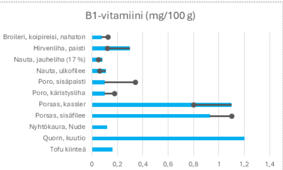 Quornin B1-vitamiinipitoisuus on jopa suurempi kuin sianlihassa (1,2 mg/100 g), mutta nyhtökauran ja tofun pitoisuudet ovat samaa suuruusluokkaa broilerin-, hirven- ja poronlihan kanssa (0,1–0,3 mg/100 g).