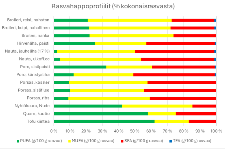 Uusia lihatuloksia vertailtiin soveltuvin osin Finelin aikaisempiin arvoihin sekä vuonna 2022 analysoituihin nyhtökauraan, quorniin ja tofuun, jotka ovat yleistyneet lihaa korvaavina proteiininlähteinä.