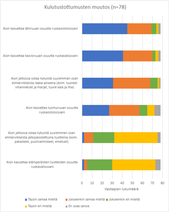 Näissäkin vastauksissa korostuivat laadukkaita raaka-aineita suosivat kuluttajatrendit. Myös aiemmissa tutkimuksissa on todettu, että lähiruokaan sitoutuneiden kuluttajien tärkeimpiä arvoja ovat ruuan laatu, tuotantoketjun läpinäkyvyys sekä sosiaaliset ja ympäristövaikutukset. Lähiruokaan sitoutuneet kuluttajat ovat myös valmiita näkemään vaivaa saadakseen arvomaailmaansa vastaavaa ruokaa.