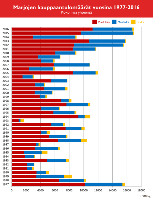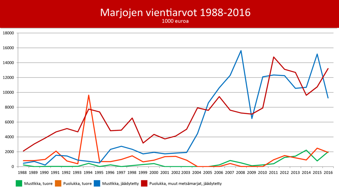 Tuoreiden ja jäädytettyjen mustikoiden ja puolukoiden viennin kokonaisarvo oli vuonna 2016 reilut 26 miljoonaa euroa ja jalostettujen tuotteiden vientiarvo noin 10 miljoonaa euroa.