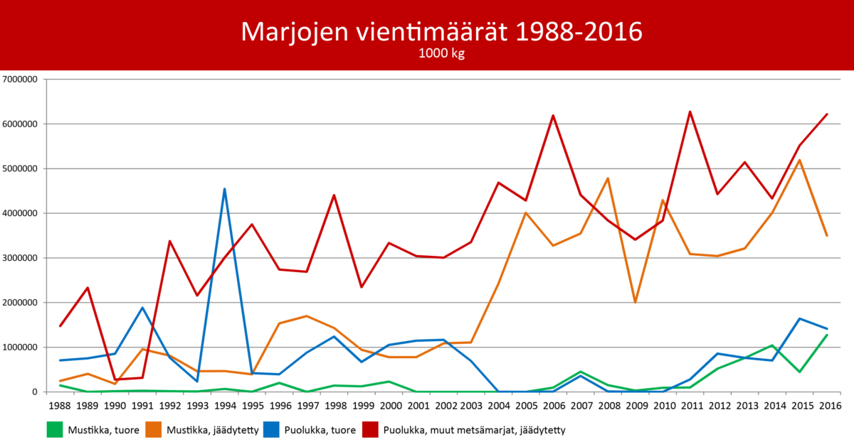 Tuoreitten ja jäädytettyjen mustikoiden ja puolukoiden vientimäärät olivat vuonna 2000 noin 5,4 miljoonaa kiloa. Vuonna 2016 määrät olivat nousseet noin 12,4 miljoonaan kiloon. Tuoreitten ja jäädytettyjen mustikoiden ja puolukoiden viennin kokonaisarvo ylsi vuonna 2016 noin 26,4 miljoonaan euroon, kun luku oli vuonna 2000 noin 7,5 miljoonaa euroa.