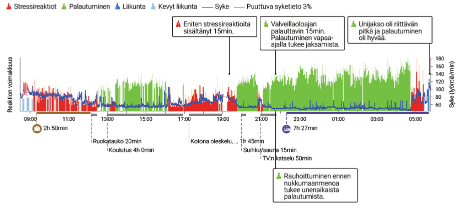 Kun selvitettiin kahden ammattikeittiön henkilöstön työhyvinvoinnin tilaa FirstBeat -mittauksin, tulokset olivat sekä alku- että loppumittauksissa samansuuntaisia. Työpäivän aikaista palautumista ei työstä juurikaan tapahtunut, vaikka henkilöstölle toteutettiin lukuisia ergonomia- ja työhyvinvointitoimenpiteitä. Mittauksissa oli nähtävissä havaintoja kuitenkin siitä, että työntekijät osaavat ja pystyvät palautumaan