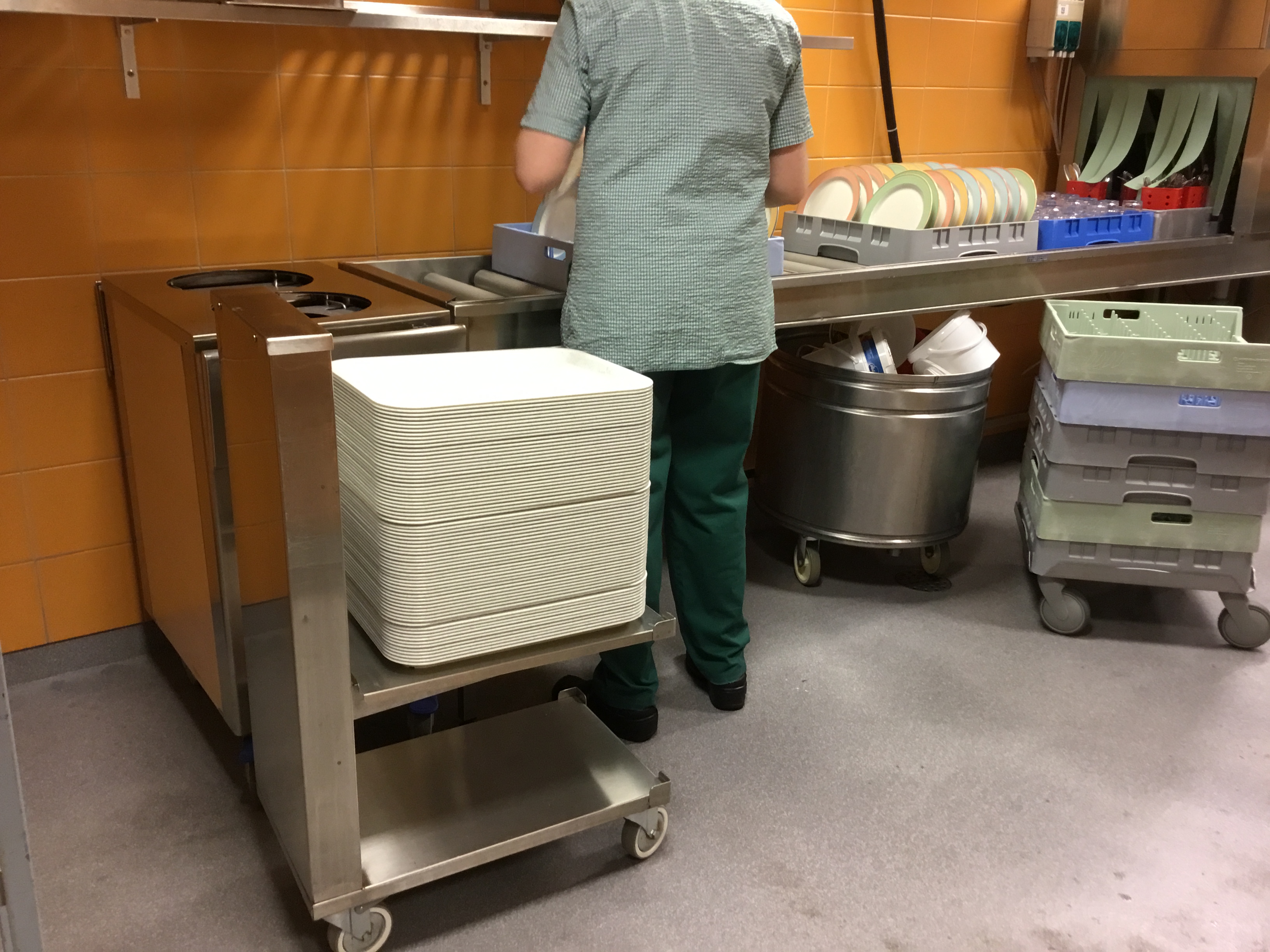 Astioiden palautuslinjastossa rasitusta saadaan vähennettyä välttämällä turhaa kurottelua. Astioita ei tarvitse koko ajan siirrellä koreissa. Tarvittaessa voidaan vetää astiakoreja lähemmäksi itseä ja sen jälkeen tehdä tarvittavat korjausliikkeet. Yleisenä ohjeistuksena onkin hyvä pitää, että annetaan astiakorien täyttyä ja tarvittaessa ohjataan ja opastetaan toiminnassa. Tarjotinvaunut helpottavat tarjottimien siirtämistä astianpesuun. Tarjottimia koreihin ladottaessa saadaan käsien rasitusta ja kiertoliikkeitä vähemmäksi, kun otetaan tarjotinvaunu viereen ja ladotaan siitä tarjottimet astianpesukoriin.