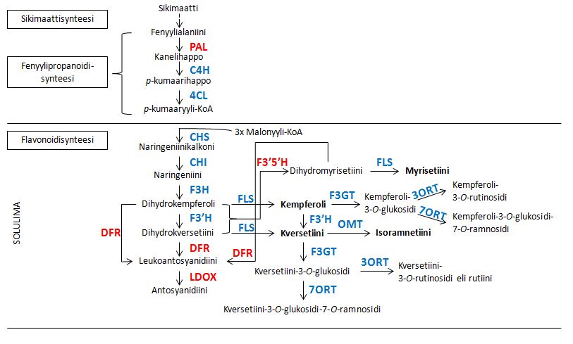 Tutkimuksessa selvitettiin lajikkeiden marjoista flavonolien biosynteesigeenien ohjaamaa entsyymituotantoa. Eri kypsyysasteella poimittujen marjojen hedelmälihasta ja siemenistä erikseen eristetyistä RNA-näytteistä (ribonukleiinihappo) analysoitiin valittujen geenien ilmenemistasojen muutoksia kvantitatiivisella polymeraasiketjureaktio-tekniikalla (PCR) eri kasvupaikoilla ja -kausina.