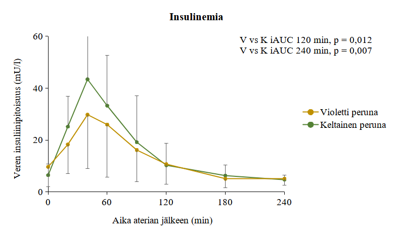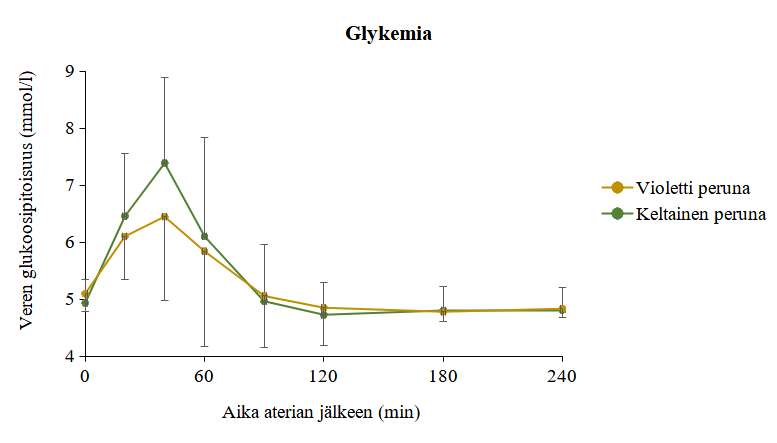 Tutkimuksessa havaittiin ensimmäistä kertaa, että violetin perunasurvoksen nauttiminen aiheutti pienemmän aterianjälkeisen glukoosi- ja insuliinivasteen verrattuna keltaiseen perunaan (kuva 2) terveillä tutkimushenkilöillä. Glukoosipitoisuus oli tilastollisesti merkitsevästi (p<0,05) alhaisempi 40 minuuttia violettia perunaa sisältäneen aterian jälkeen. Lisäksi violetti peruna aiheutti tilastollisesti merkitsevästi alhaisemman kokonaisinsuliinivasteen kuin keltainen perunasurvos.
