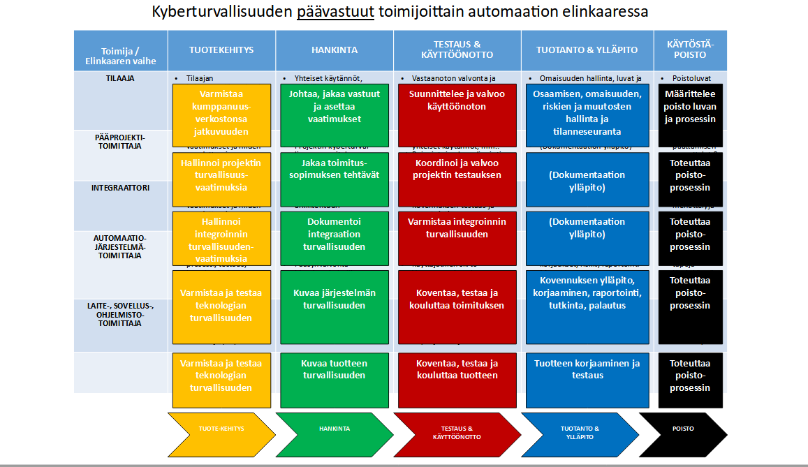 Hankkeen jalkautus etenee käytännössä parhaiten jakamalla vastuut selkeästi eri toimijoille. Kuvassa 1 esitetään teollisuuden kanssa yhteistyössä kehitetty vastuumatriisi kyberturvallisuuden päävastuista automaation elinkaaren aikana. Se toimii lähtökohtana ja yleiskuvana päätehtävistä ja työnjaosta toimijoittain, ja sitä tulee soveltaa ja muokata tilaajan kuhunkin tilanteeseen soveltuvaksi.