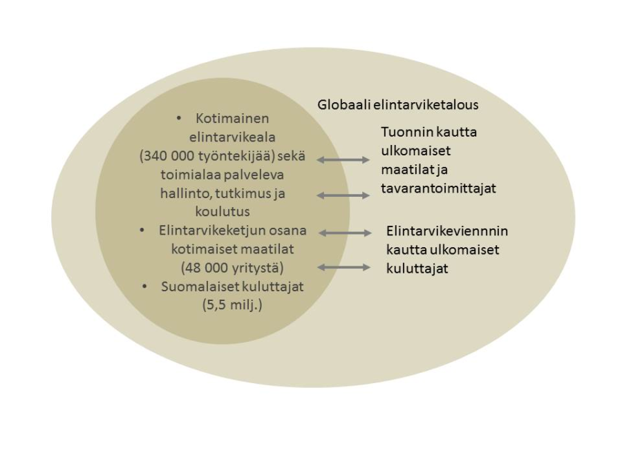 Ruokailun ja ruokahankintojen juuret ulottuvat pitkälti Suomen rajojen ulkopuolelle. Elintarvikealan suurimmat tuontipanokset koskevat energiaa, jota kuluu kaikissa ruokaketjun vaiheissa. Merkittäviä tuontipanoksia ovat myös typpilannoitteisiin käytettävä ammoniakki, kasvinsuojeluaineet sekä rehut, mmun muassa soijapuriste. Valmiita elintarvikkeitakin tuodaan merkittävässä määrin. Kun suomalaisen ruokaviennin arvo on 1,2 miljardia, tuonti on tähän verrattuna yli nelinkertainen.