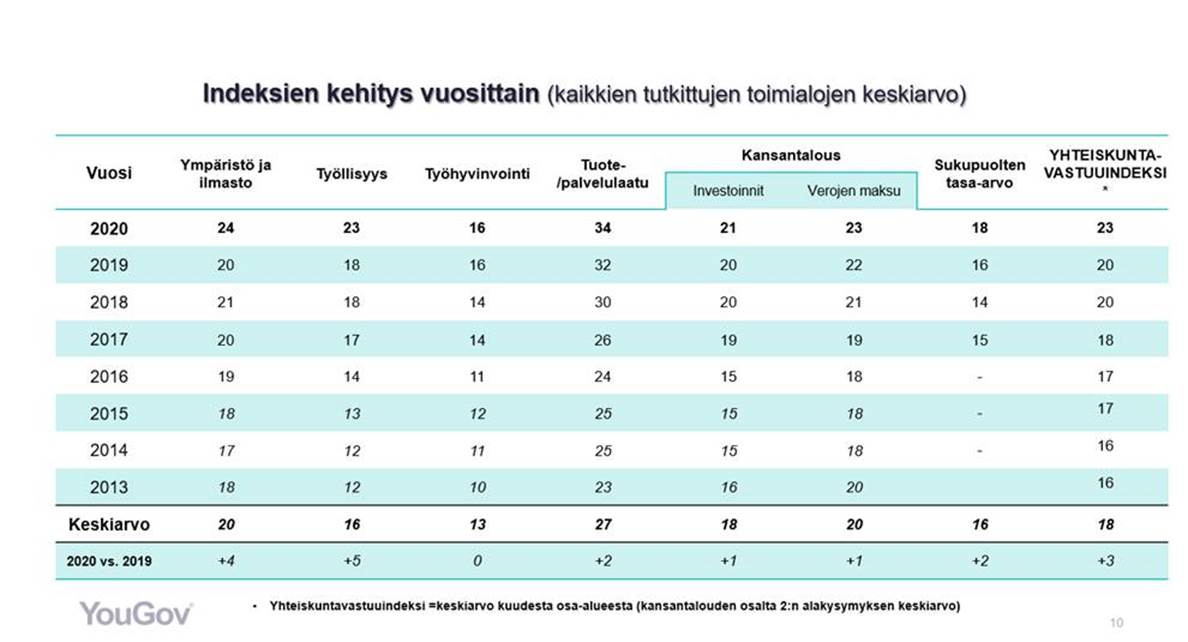 YouGov on tutkinut suomalaisten asenteita toimialojen yhteiskuntavastuuseen liittyen vuosittain vuodesta 2012 lähtien. Kyselytutkimuksessa kartoitettiin joulukuussa 2020 yhteiskuntavastuuta seitsemällä eri yhteiskuntavastuun osa-alueella 11 toimialan osalta nyt yhdeksättä kertaa.