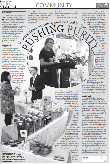 Food from Finland -vientiohjelma järjesti tammikuussa Kiinaan korkean tason delegaatiomatkan. Sen aikana käytiin Eurooppa- ja ulkomaankauppaministeri Lenita Toivakan, Eviran pääjohtajan Matti Ahon ja maa- ja metsätalousministeriön johtajan Aulikki Hulmin johdolla viralliset neuvottelut suomalaisten elintarvikkeiden maahantuontilupien laajentamisesta. Neuvotteluihin osallistuivat myös muut Suomen elintarvikealan keskeiset toimijat.
