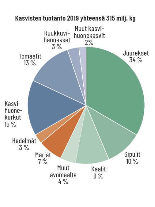 Pinta-alallisesti tärkein kasvis on tarhaherne, josta merkittävä osa käsitellään pakasteherneeksi. Kilomääräisesti tärkein vihannes on porkkana, josta osa myydään tuoreena kuluttajille ja osa menee elintarviketeollisuuden käyttöön. Tuotantoarvoltaan merkittävin avomaan vihannes on porkkana, marjoista mansikka ja kasvihuonetuotannossa tomaatti.