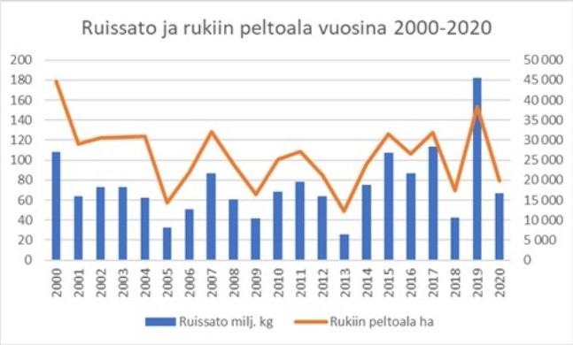 Vaihtelua selittää viljellyn pinta-alan vaihtelu. Vuonna 2019 rukiin viljelyala oli Luken tilastojen mukaan suurin 18 vuoteen. Suuren viljelyalan ja erinomaisten kasvukauden olosuhteiden myötä korjattu sato nousi suurimmaksi lähes 30 vuoteen. Kuluvana syksynä hyvästä satotasosta huolimatta ruista puitiin edellistä vuotta huomattavasti vähemmän, sillä rukiin viljelyala jäi lähes puoleen edelliseen vuoteen verrattuna: vuonna 2019 ruista viljeltiin yli 38 000 hehtaarin alueella, kun tänä syksynä luku oli vajaa 20 000 hehtaaria. Toki satotasollakin on merkityksensä, sillä syksyn 2019 huikea 4 820 kg:n hehtaarisato (yhden hehtaarin alueelta puitu ruissato) oli kaikkien aikojen korkein. Tänä syksynä puidun rukiin hehtaarisato, 3 380 kg/ha, on sekin kymmenen vuoden vertailujakson keskimääräistä hehtaarisatoa parempi. Hehtaarisadon nousuun on vaikuttanut uusien, viljelyvarmempien ja satoisampien lajikkeiden viljely.