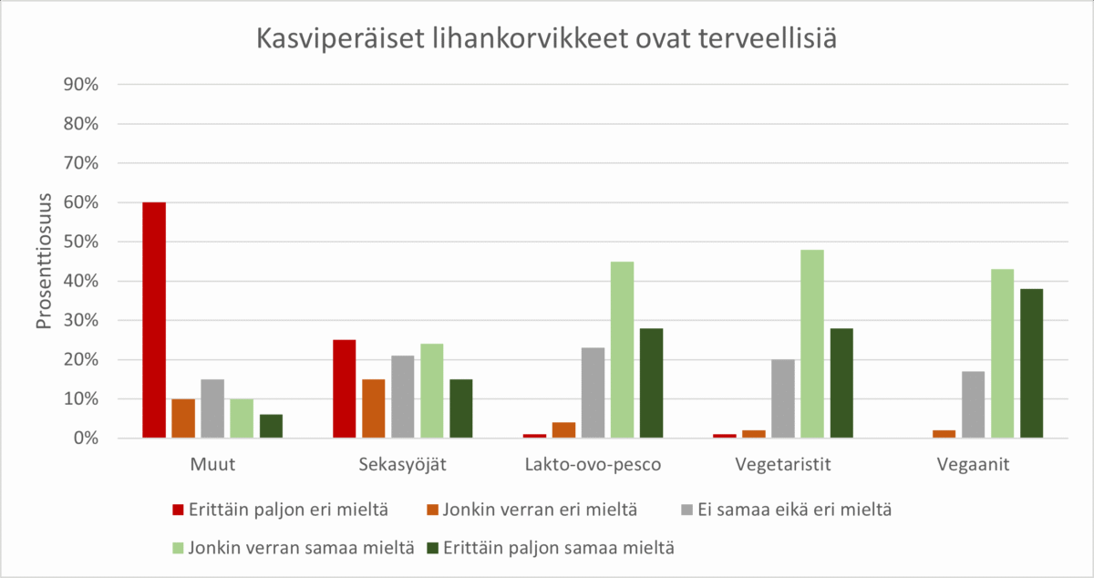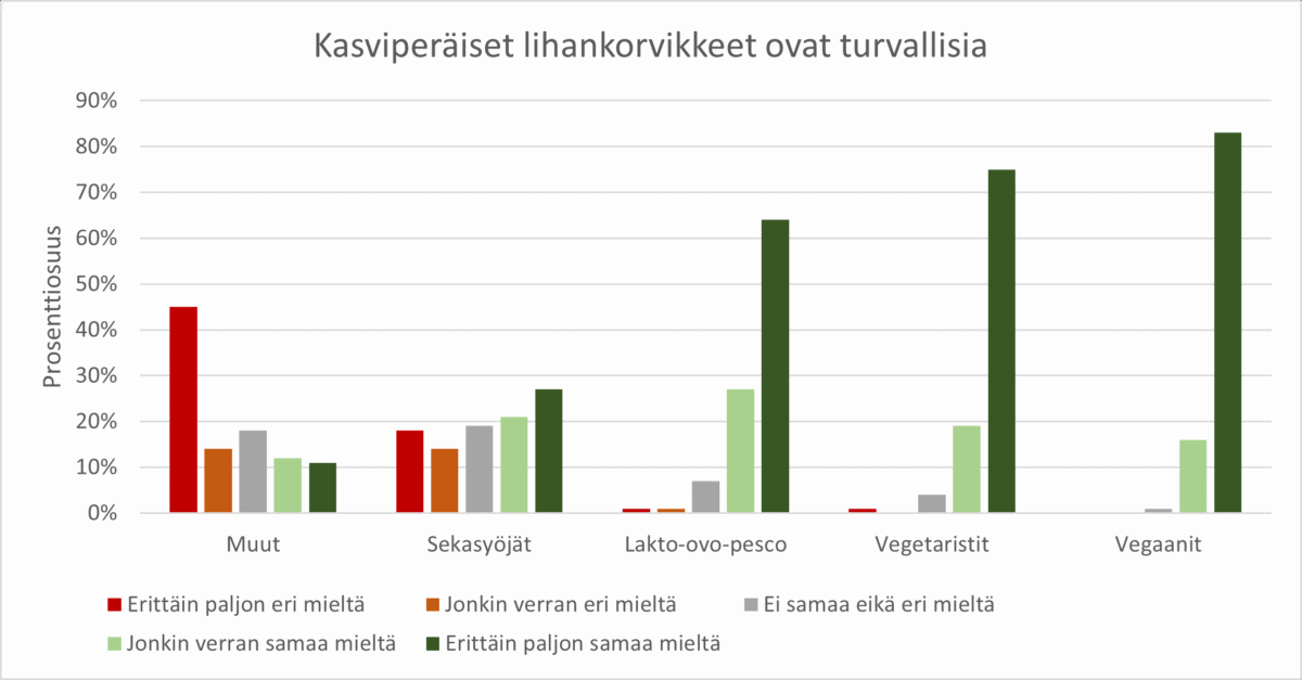 Kyselyn tuloksista huomataan, että etenkin pääasiassa eläinperäistä ruokavaliota noudattavat ihmiset ovat varautuneempia, kun kysytään lihankorvikkeiden terveellisyydestä ja turvallisuudesta. Muut-ryhmään kuuluvista 60 prosenttia oli erittäin paljon eri mieltä väitteestä, että kasviperäiset lihankorvikkeet ovat terveellisiä, ja 45 prosenttia heistä oli erittäin paljon vastaan myös väitettä korvikkeiden turvallisuudesta.