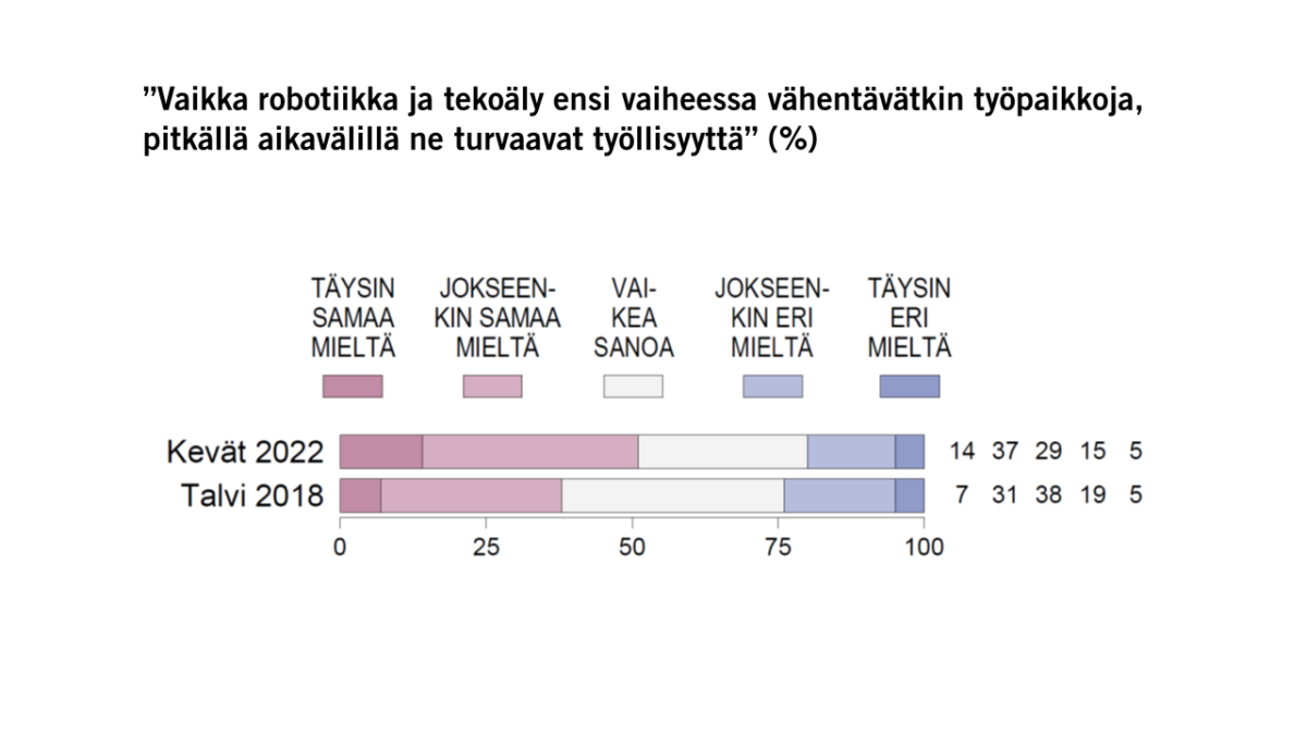 Suomalaisten suhtautuminen tekoälyyn, robotteihin sekä tieteen ja teknologian kehitykseen on muuttunut aiempaa myönteisemmäksi, käy ilmi Elinkeinoelämän valtuuskunta EVAn Arvo- ja asennetutkimuksesta. Suomalaisista 51 prosenttia katsoo, että robotiikka ja tekoäly turvaavat pitkällä aikavälillä työllisyyttä, vaikka ne ensi vaiheessa vähentävätkin työpaikkoja. 20 prosenttia on toista mieltä.