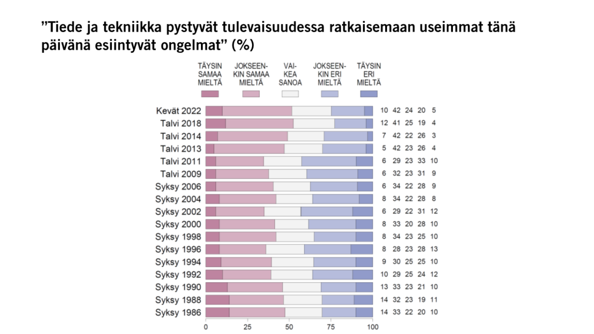 Yli puolet (52 %) suomalaisista luottaa tieteen kykyyn ratkaista useimmat nykypäivän ongelmat, ja vain neljäsosa (25 %) ei luota. Erityisen optimistisesti tieteeseen ja teknologiaan suhtautuvat miehet, nuoret ja korkeasti koulutetut.